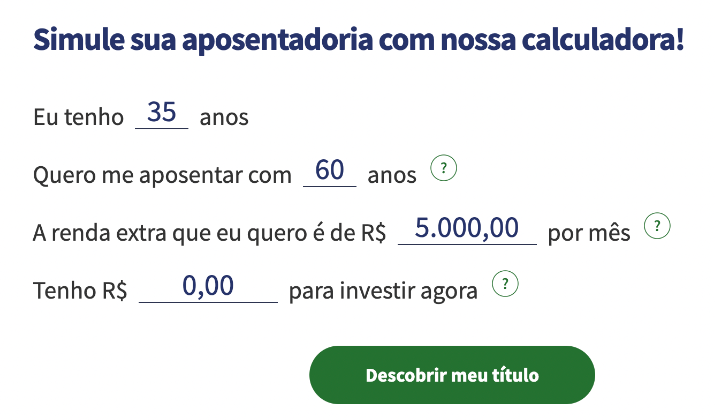 Após os dados preenchidos, você receberá uma sugestão de título com vencimento próximo da idade que deseja aposentar. O simulador informará quantos títulos você precisa comprar por mês para atingir o seu objetivo de aposentadoria.